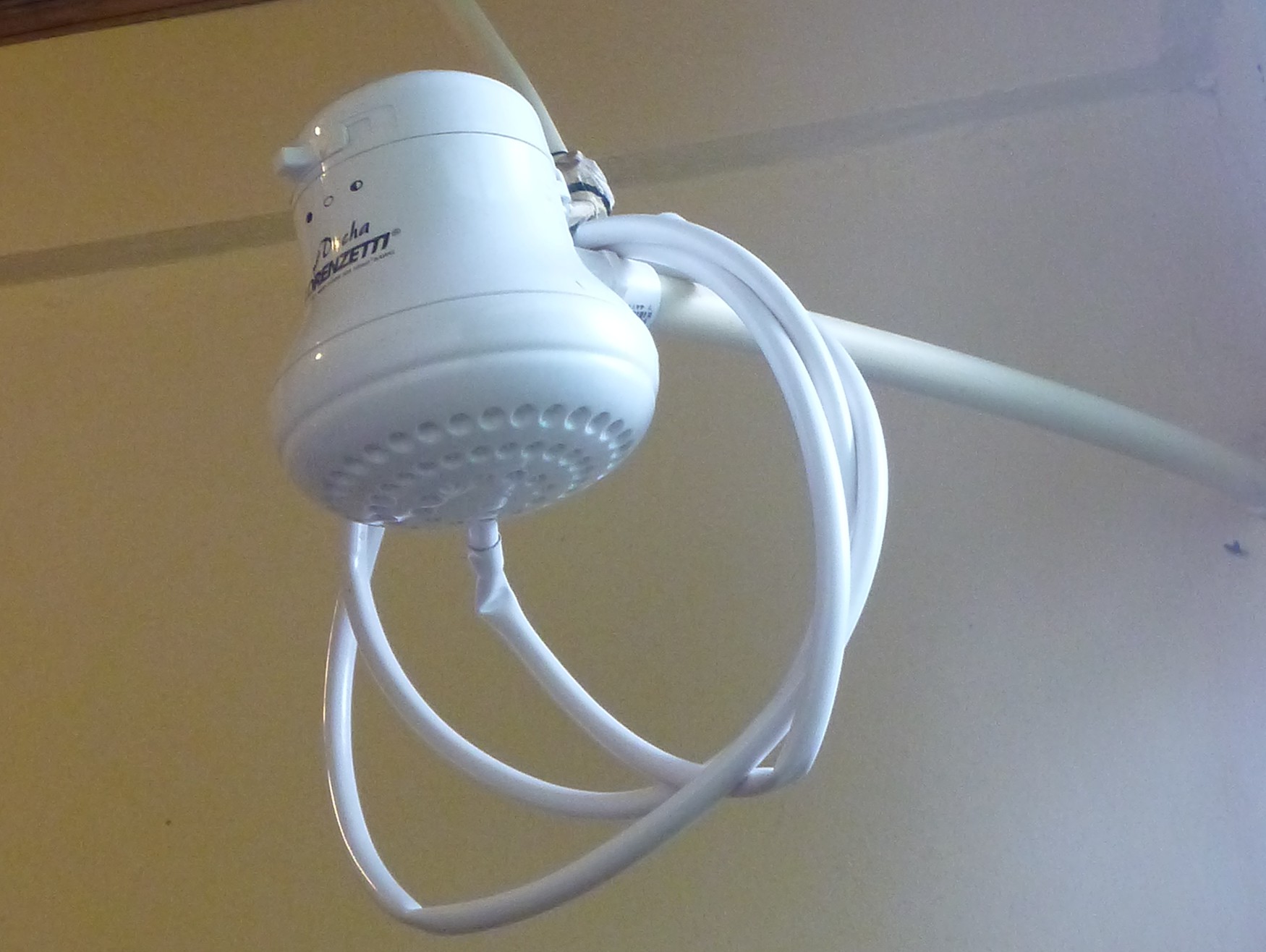 Typically, Costa Rican homes have only cold water running through the taps, although there is hot water in the showers. In this home there is hot water only in the shower, the water is instantly heated as it passes through the showerhead. To cool the water, you increase the water pressure. This device is often run by electricity. The shower is the same size as our typical bathtubs; there are no bathtubs here. The shower is slightly lower than the rest of the tiled bathroom. Lastly, TP goes in the trash.