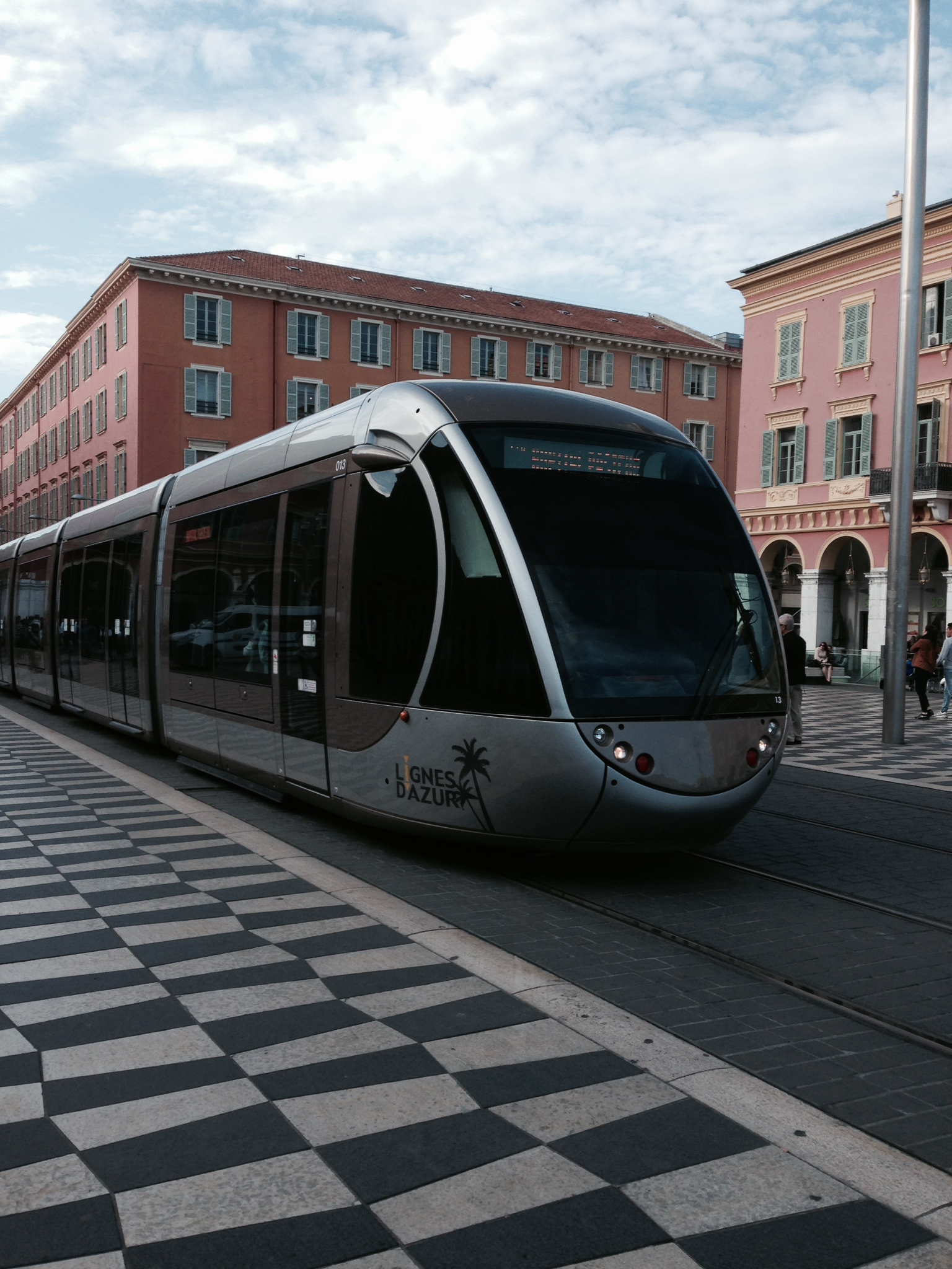 We were on our way to the museum of modern art here in Nice. It was rush hour and the platform where we buy the tickets and board the tram was very congested. We had just missed a tram, but another one was coming, so we lined up and got our tickets just as the train pulled in. Of course, a crowd of people getting on and off meant we were in the middle of the chaos.